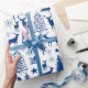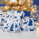 Un papier d'emballage de vacances d'hiver avec un motif de rennes bleus dans une forêt boisée d'arbres en silhouette sur un arrière - plan de couleur blanche.
