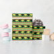 Les rhinocéros noirs et jaunes traversent des bandes vertes en alternance avec des rayures "tissées" aux couleurs africaines, rouges, noires et vertes aux accents jaunes.