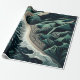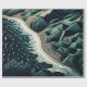 Rivages sereins : Cette superbe illustration vue de dessus capture l'harmonie de la terre et de la mer, avec des vagues qui se brisent doucement sur les plages de sable et des montagnes verdoyantes à l'arrière-plan. Réalisée dans des nuances apaisantes de bleu-vert foncé, l'œuvre d'art évoque un sentiment de tranquillité et d'équilibre. Le détail complexe des motifs de l'océan rencontrant le rivage, associé aux arbres bordant le bord de l'eau, renforce l'atmosphère paisible. Créée dans un style de gravure sur bois avec des lignes simples et un design plat, la pièce rappelle l'animation dessinée à la main, offrant une représentation intemporelle et sereine de la beauté de la nature.
