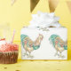 Illustration de coq colorée inspirée des couleurs vintages utilisées dans un motif sur papier d'emballage.
