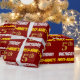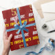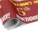 Ce papier d’emballage comporte un message comme "FIRST-NAME’S 5th BIRTHDAY!", avec le "5th" ayant une apparence de couleur fausse/imitation or, et avec le nom et "BIRTHDAY" dans une police amusante et audacieuse. Le nom peut être customisé, et l'arrière - plan est de couleur rouge. Un papier comme celui-ci pourrait peut-être être utilisé pour envelopper les cadeaux d'anniversaire donnés à quelqu'un pour célébrer leur cinquième anniversaire. [~Z0000204]