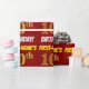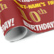 Ce papier d’emballage comporte un message comme "FIRST-NAME’S 10th BIRTHDAY!", avec le "10th" ayant une apparence de couleur fausse/imitation or, et avec le nom et "BIRTHDAY" dans une police amusante et audacieuse. Le nom peut être customisé, et l'arrière - plan est de couleur rouge. Un papier comme celui-ci pourrait peut-être être utilisé pour envelopper les cadeaux d'anniversaire donnés à quelqu'un pour célébrer son dixième anniversaire. [~Z0000204]