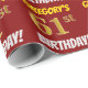 Ce design papier d’emballage comporte un message comme "61e ANNIVERSAIRE GREGORY!", avec le "61e" ayant une apparence de couleur fausse/imitation or, et avec le nom et "ANNIVERSAIRE" dans une police amusante et audacieuse. Le nom peut être personnalisé, et l'arrière - plan est de couleur rouge. Un papier comme celui-ci pourrait peut-être être utilisé pour envelopper les cadeaux d'anniversaire donnés à quelqu'un pour célébrer leur soixante et unième anniversaire. [~Z0000204]