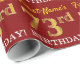 Ce papier d’emballage comporte un message comme "73e anniversaire de prénom!", avec le "73e" ayant une apparence de couleur fausse/imitation or. Le nom peut être customisé, et l'arrière - plan est de couleur rouge. Il pourrait peut-être être utilisé pour envelopper les cadeaux donnés pour le soixante-treize anniversaire de quelqu’un. [~Z0000178]