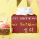 Ce design papier d’emballage comporte un message comme "1er anniversaire de prénom!", avec le "1er" ayant une apparence de couleur fausse/imitation or. Le nom peut être customisé, et l'arrière - plan est de couleur rouge. Il pourrait peut-être être utilisé pour envelopper les cadeaux donnés pour le premier anniversaire de quelqu’un. [~Z0000178]