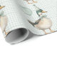 Ce papier d'emballage d'inspiration rétro présente un adorable canard habillé d'un casquette de fête et d'une cravate d'arc, tenant un ballon fantaisiste. L'arrière - plan doux vert sauge en vichy ajoute un aspect rustique et cosy.