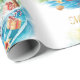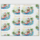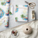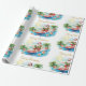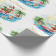 This Surfing Santa Christmas in July Coastal Wrapping Paper features jolly Santa in a Hawaiian floral shirt and red shorts, riding bright turquoise waves under swaying palm trees.