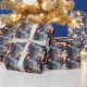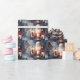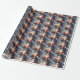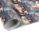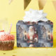Joli papier d'emballage avec une image du Père Noël tenant une lanterne, debout devant une maison il vient de livrer des cadeaux à