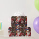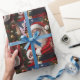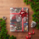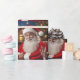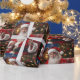 Papier enveloppant avec une photo de près de Santa Clause qui est souriant et agitant, assis devant un sapin de Noël. Ce design a été créé par Debbie Quick de Debs Creative Images : www.debscreativeimages.com