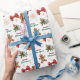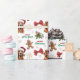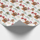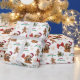 The repeated pattern on this Christmas wrapping paper includes an image of a beautiful Irish Setter dog wearing a red and white Santa Claus hat. Also included in the pattern is a gingerbread man, a red bow, a holly sprig with red berries, and varied sizes of ornate gold snowflakes. Stylized red and green text says MERRY CHRISTMAS" and "HAPPY NEW YEAR". Be sure to see the matching gift tags in our store.