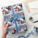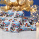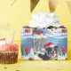 Illustration de vacances pleine de charme avec un chien gai jouant dans la neige, portant un chapeau de Père Noël et entouré de boîtes cadeaux colorées. Dans l'arrière - plan, les enfants construisent un bonhomme de neige à côté d'un sapin de Noël enneigé, créant un merveilleux pays hivernal. Parfait pour répandre la joie des fêtes et capturer la magie de Noël.