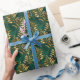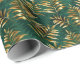 Seamless pattern of gold, jewelry, shiny fern branches and leaves on green, woodland, textured background. Golden fern.
