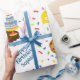 Papier d'emballage de célébration d'anniversaire personnalisé amusant. Avec motif avec Cookie Monster cuire un gâteau de biscuit à la puce à chocolat, tranche de gâteau, biscuit, ballons et confettis. Personnalisez en ajoutant l'âge et le message de votre enfant.