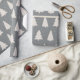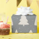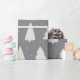 Ce papier d'emballage de Noël présente des silhouettes de pins blancs et de petits flocons de neige blancs sur un élégant arrière - plan gris argenté.