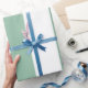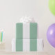 Papier d'emballage rayé brillant en vert et blanc. Des étiquettes cadeaux "joie" correspondant sont disponibles.