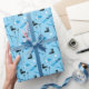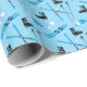 Fabulous blue wrapping paper patterned with skiing equipment including boots, skis, poles and goggles. Perfect for skiers and snow sports fans.