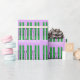 Skis verts sur neige avec papier d'emballage de Noël arrière - plan violet.