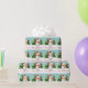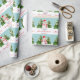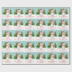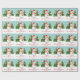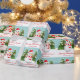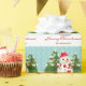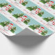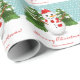 Ce papier d'emballage à thème de Noël personnalisable et festif présente l'illustration de Destei d'un bonhomme de neige mignon. Le bonhomme de neige porte un casquette rouge et une écharpe à rayures rouges et blanches. Son nez est fait d'une carotte orange et ses bras sont faits de bâtons bruns. Derrière le bonhomme de neige se trouvent deux sapins avec de la neige sur eux. La couleur arrière - plan est turquoise avec un motif de points comme neige tombante. Sous l'image on peut lire "Joyeux Noël !" en rouge. Il y a aussi une zone de texte personnalisable où vous pouvez écrire soit à qui le cadeau est pour ou de qui il est, par exemple.