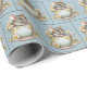 Mignonne souris grise dans une tasse marguerite avec soucoupe isolée sur un arrière - plan bleu doux.