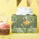 Une petite souris mignonne portant une robe jaune et un arc est assise sur une balançoire entourée de marguerites