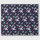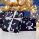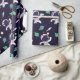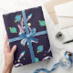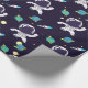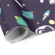 Papier d'emballage à motifs avec un arrière - plan bleu foncé aux étoiles jaunes éparpillé autour. Couché sur le dessus est l'illustration d'un astronaute vêtu d'une combinaison blanche flottant dans l'espace. Au loin, il y a des planètes avec des anneaux et un vaisseau-fusée qui explose vers des endroits inconnus.