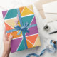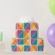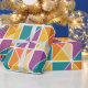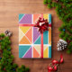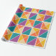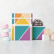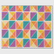 Ce papier d'emballage a un design Bauhaus de carrés en triangles dans les tons orange, jaune, violet et bleu.