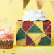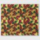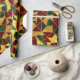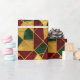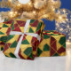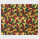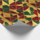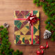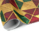 A red, green, and gold abstract geometric pattern in stained glass style decorates this gift wrap. Gold is not glitter or foil. AI-generated by IveyCottage.