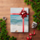Envelopper le papier avec une photo pittoresque. Une grande étoile de mer dressée sur une plage de sable. Une belle mer bleue avec des vagues de surf blanc en arrière - plan.