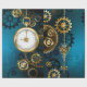 Arrière - plan turquoise, texturé, steampunk avec des engrenages en laiton et or, une clé en argent et l'horloge. Style Steampunk.