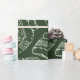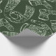 Des mitaines, foulards, chaussettes et chandails dessinés à la main et posés en blanc contre un arrière - plan vert. Enveloppe cadeau de Noël cosy et festif!