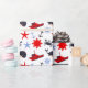 Papier d'emballage nautique orienté comportant une baleine, un bateau, une roue du bateau, un soleil, des ancres, un crabe et une étoile de mer.