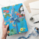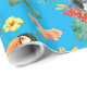 Motif tropical avec toucans, hibiscus, hélionia et anthurium sur un bleu vif.