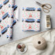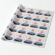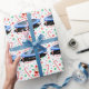 Creative trampoline gymnastics themed holiday gift wrap or party decor featuring Mrs. Claus gymnast jumping on a trampoline surrounded by Christmas candy. To personalize edit text to add name.