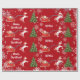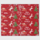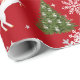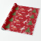 Elegant, modern, festive personalized Christmas wrapping paper with a unicorn pulling Santa's sleigh towards a fir tree decorated with silver baubles. The unicorn has a red and golden mane and tail and the sleigh carries Santa along with many gifts. The text boxes say "Merry Christmas!" and the name of the recipient (make sure you personalize it!). On a Christmas red background, with many cute snowflakes.