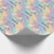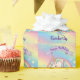 Ce papier d'emballage mignon et coloré présente une belle illustration d'un arc-en-ciel couleur unicorne et pastel, sur un arrière - plan en arc-en-ciel dégradé. La parties scintillant en or faux accentue les parties supérieure et inférieure de l'illustration. De petites étoiles aux couleurs assorties entourent l'arc-en-ciel. Un exemple de bannière Joyeux Anniversaire est imprimé au-dessus de la licorne, et un exemple de nom est imprimé ci-dessous dans une police de caractères violets élégante. Vous pouvez personnaliser l'emballage cadeau pour inclure votre propre nom ou texte personnalisé.