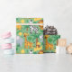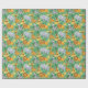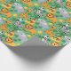 Unrolled and flat views of gift wrap featuring a colorful pattern of smiling lions, giraffes, zebras, and elephants on a green background. Playful and cheerful.