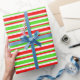 Cette décoration sur le thème de Noël présente des rayures rouges, blanches et vertes. Un papier comme celui-ci peut être utilisé pour préparer des cadeaux ou des cadeaux donnés pour célébrer un anniversaire, un mariage, un anniversaire ou tout autre événement.