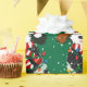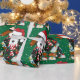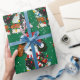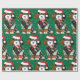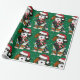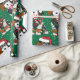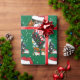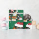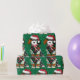 Cartoon Bernedoodle Festive Personnalisé en noir / Tan / Blanc Marionnette portant le chapeau de Père Noël "Tis The Season", foulard rayé rouge et blanc, enveloppé de lumières de Noël. Arrière - plan neigeux. Papier d'emballage vert fin noël pour les amateurs de bernedoodle !