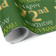 Ce design papier d'emballage comporte un message comme "HAPPY 72nd BIRTHDAY", avec le "72nd" ayant une apparence fausse/imitation or. Il comporte également un nom qui peut être personnalisé, et un arrière - plan de couleur verte. Il pourrait peut-être être utilisé pour envelopper les cadeaux donnés pour le soixante-douzième anniversaire de quelqu’un. [~Z0000132]