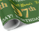 Ce design papier d’emballage comporte un message comme "97e anniversaire de prénom !", avec le "97e" ayant une apparence de couleur fausse/imitation or. Le nom peut être personnalisé, et l'arrière - plan est vert couleur. Il pourrait peut-être être utilisé pour envelopper les cadeaux donnés pour le quatre-vingt-dix-septième anniversaire de quelqu’un. [~Z0000179]