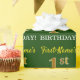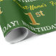 Ce design papier d’emballage comporte un message comme "1er anniversaire de prénom!", avec le "1er" ayant une apparence de couleur fausse/imitation or. Le nom peut être customisé, et l'arrière - plan est vert de couleur. Il pourrait peut-être être utilisé pour envelopper les cadeaux donnés pour le premier anniversaire de quelqu’un. [~Z0000179]