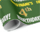 Ce modèle de papier d'emballage comporte un message comme "ANNIVERSAIRE DE PRENOM 4 ans !", avec le "4" ayant une apparence de couleur dorée fausse/imitée, et avec le nom et "ANNIVERSAIRE" dans une police amusante et grasse. Le nom peut être personnalisé, et le fond est de couleur verte. Du papier d'emballage comme celui-ci pourrait peut-être être utilisé lors de l'emballage de cadeaux d'anniversaire offerts à quelqu'un pour célébrer son quatrième anniversaire.