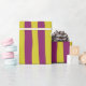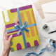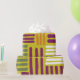 Papier d'emballage violet, orange et vert pour les anniversaires.
