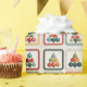 A playful grid of nine festive illustrations, each with vibrant Christmas ornaments or stylized tree shapes in triangular arrangements. Framed in bold holiday hues, this cheerful design brings a pop-art twist to seasonal decor and gifting.