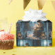 Un vieil homme habillé chaudement s'assied sur une rondelle dans une forêt enneigée avec un lapin tenant un cône de pin brillant ressemblant à un petit arbre de Noël.