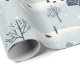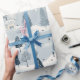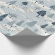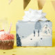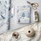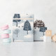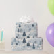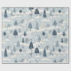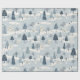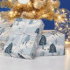 Un motif de village de Noël moderne et doux, bleu neigeux et crème, parsemé de petites maisons détaillées et d'arbres bleu monochromatique.