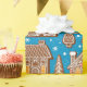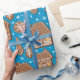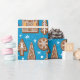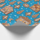 Motif vectoriel tiré à la main avec diverses maisons en pain d'épice, sapins, flocons de neige et biscuits en forme de croissant sur le bleu avec chute de neige