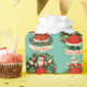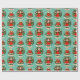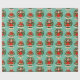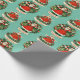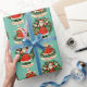 Ce motif est doté d'un arrière - plan turquoise plus léger, avec le dessin répété d'une fille vêtue d'une robe de fête rouge classique, associée à des illustrations du Père Noël et à des couronnes festives. Les images sont encadrées de bannières "Joyeux Noël" ou "Joyeux Fêtes", ajoutant une touche vintage et délicieuse au motif en général. Le design est élégant mais ludique, ce qui le rend parfait pour envelopper des cadeaux spéciaux.