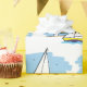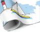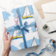 Les caractéristiques de conception ce d'amusement un dessin de bande-style d'un voilier sur l'eau près de la terre et d'un phare rouge-et-blanc ont soutenu par un ciel bleu-clair.