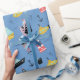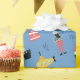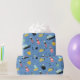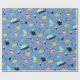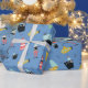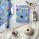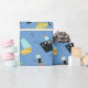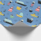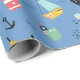 Papier à envelopper avec un joli motif avec voiliers et navires en caricature jaune et noir, de mignons sous-marins, un marin à la barbe noire, un pantalon rouge et une pipe, un phare rouge et blanc, et une ancre noire sur un arrière - plan bleu clair décoré de petites bulles et des vagues.